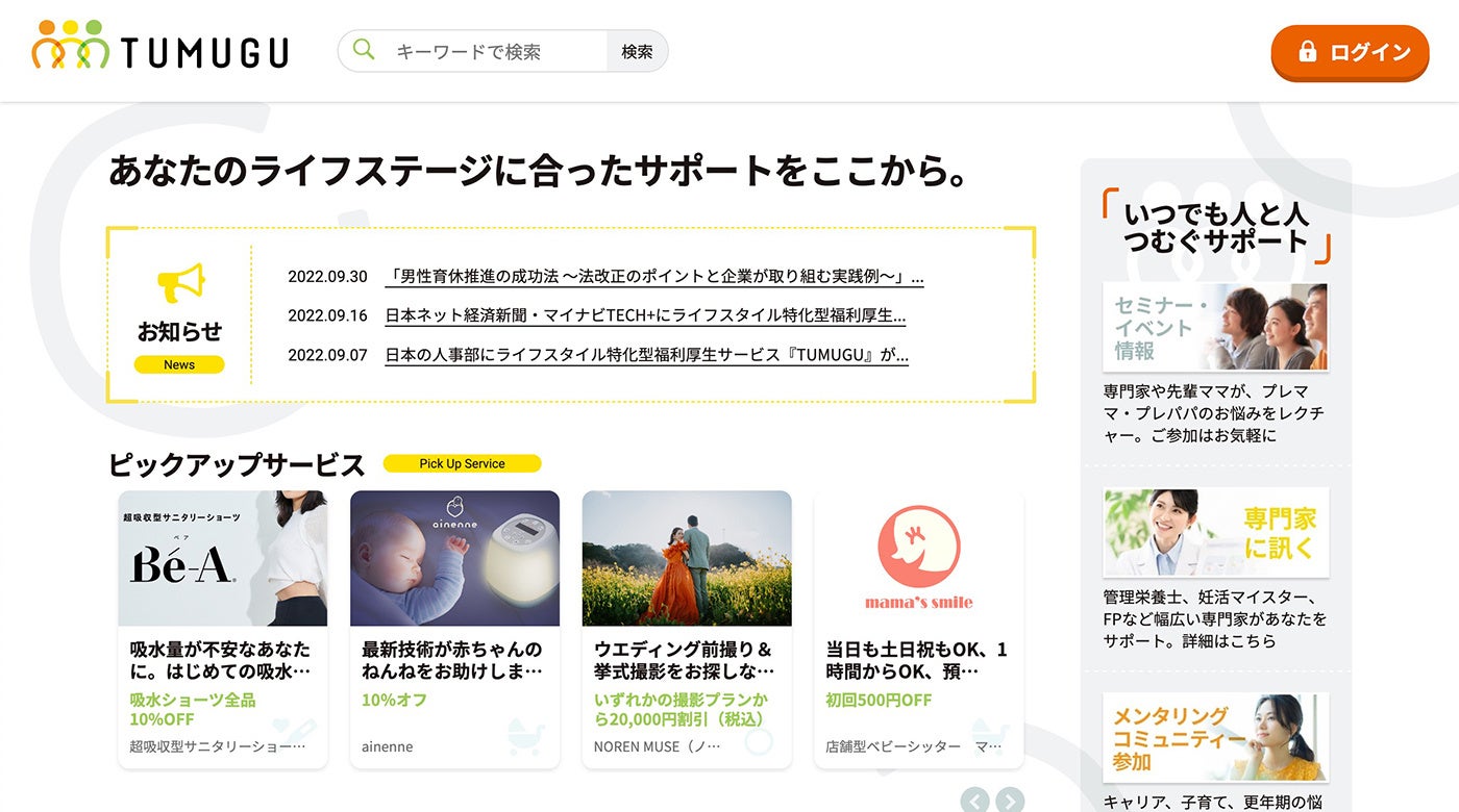 プレスリリース【10/1施行 産後パパ育休(出生時育児休業)推進応援!】ライフステージ特化型福利厚生サービス「TUMUGU」提供開始